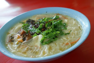 当时听到钟声响的我们,才惊觉原来自己的肚子已经打鼓了,只是我们没留意到。。嘻嘻。。以最快的速度收拾东西后,直奔jonker street找东西吃。。只可惜,那里的面食档都快收档了,没什么选择。。左看右看,结果选了云吞面,要了碗kosong的云吞面,弟弟也有点好奇,哪有人吃云吞面却不要云吞只要面和青菜。。哇咔咔!! 有了第一晚的经验,我们学精了,会先找食物,不会又误了黄金时机。。第二天早餐当然就是那间寻遍已久的素食店-水仙素食,听老大的话叫了碗素鱼头米粉,;莹姑叫了碗粥;老国更过份叫了“素烧卖”还有碗laksa。。