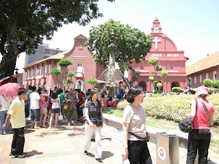 三天两夜到底能否游完马六甲的名胜地呢??单凭11号巴士的我们又能参观到什么地方呢??有点怀疑,但还是跟大队,重点是随缘。。嘻嘻!!不过,回想起来、数一数,还是要称赞一下莹姑、老国还有我自己,因为我们去的景点真的不少啊!!第一天去的有青云亭(Cheng Hoon Teng Temple)、中国山- 公坟(Bukit China)、苏丹井(Sultan’s Well)、马六甲河口、Jalan Tun Tan Cheng Lock、Capitol Satay (吃satay celup)等等。。 第二天去的地方更夸张,原本只打算出去吃顿早餐就回民宿的我们,竟然早出晚归,十一二点才回民宿。。唉~~但重看照片、回想确实是个不错的回忆。。嘻嘻。。我们第二天去了水仙素食馆(在Jalan Hang Lekiu)、打跌街(Jalan Tukang Besi)、红屋、圣宝教堂(St Paul’s Church)、苏丹王宫、大炮/炮台(A Famosa)、Stadthuys、Education Museum、Cheng Ho Museum、Samudera Museum、Maritine Museum、Tentera Laut Museum、豆腐街(Jalan Hang Kasturi)、音乐喷泉(Muscical Fantastic)等等。。 当然没忘了我们每晚都会去逛的鸡场街(Jonker Street),因为我们去的那几天刚好碰上周末,所以有文化街逛,就好象pasar malam那样,不同的是那里的小贩都是华人,不像我们这里的pasar malam,走到哪里都是“包头的”。。可能因为这个原因,我们每晚回去Ringo’s Guest House前,都会去那里逛,老国也拿我们没办法,谁叫二对一??哈哈。。结果在那里吃吃喝喝,买买东西,消磨晚上的时间。。 在那里逛的那两晚,都是人山人海,还有种人贴人的感觉,挤到~~也因为这样,老国和阿祥走失了,留下我和莹姑。。还记得当时我们身上是没手机的(莹姑的手机没带出来,我的手机没电了),好怕我们遇不回,但看到那些玲琅满目的摊子,我们早已把他们俩忘了,继续陶醉在我们的购物逛街世界。。嘻嘻。。一切随缘,还好我们有默契、有缘还能碰上他们俩,原来他们是给变魔术的骗去了,死赖在那里才会走失的;而我和莹姑却是因为要买发簪而把他们俩抛弃了。。还好最后遇得回,要不然就要吃沙咯。。嘻嘻~~
